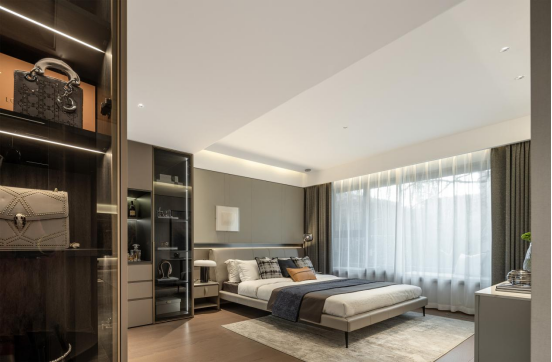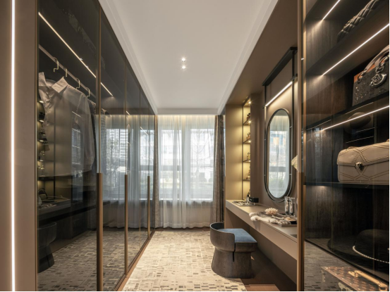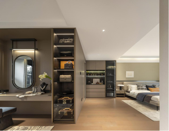 除了起居室和独立卫生间外,被纳入主卧的另一个房间,既可以像概念展示间的设计为衣帽间和化妆间,也可以根据主人的兴趣爱好来布置成自己想要的私享空间,将千万级精英家庭的生活场景再一次精进。