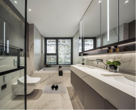 改造后的主卧将会变成一个以主人为中心的定制化套房,整体面积达到了约36㎡。其中南向开间约3.8米,进深约5.55米,起居空间约21㎡。隐藏式的主卫引入了度假酒店流行的三分离式设计,主卫设置了美妆冰箱,双台盆、独立淋浴房、浴缸、墙排智能马桶等一应俱全。