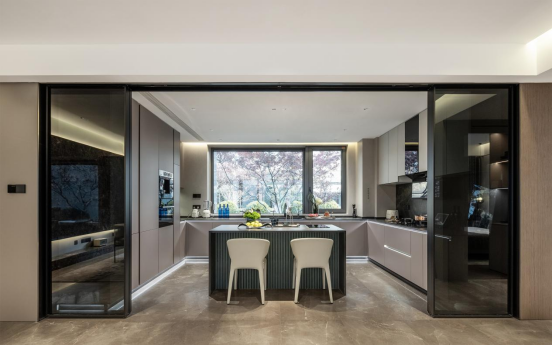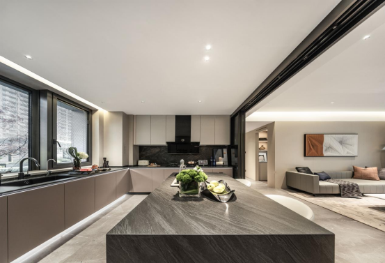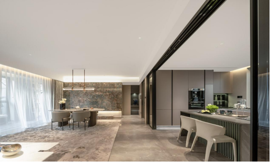 在建面约175㎡的阔绰样板房里,入户就会被约66㎡的整个LDKB体系所震撼。北向的U形大厨房开间约5.15米,面积约17.5㎡,中西厨设计,其中岛台既是西厨,也是操作台,一家人可以在此简餐,来客人了再移到正式的餐桌上。
